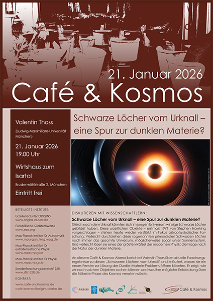 An diesem Café & Kosmos-Abend berichtet Valentin Thoss über aktuelle Forschungsergebnisse zu diesen „Schwarzen Löchern vom Urknall“ und erläutert, warum sie ein neues Fenster zur Lösung des Dunkle-Materie-Problems öffnen könnten. Er zeigt, wie wir nach solchen Objekten suchen können und was ihre mögliche Entdeckung über die früheste Phase des Kosmos verraten würde.
